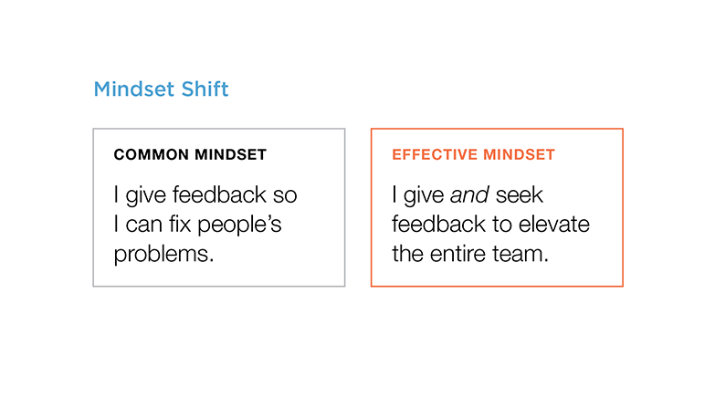 The ineffective leader mindset is to think of themselves as “the fixer”: their team has problems, so they think it’s their job to point out what the team is doing wrong through feedback. In contrast, the effective mindset is all about unleashing the potential in others—including the leader themselves, when they seek feedback.
